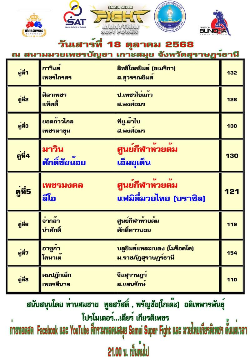ศึกรวมพลคนสมุย ประจำวันเสาร์ที่ 18 ตุลาคม 2568 ณ สนามมวยเพชรบัญชา เกาะสมุย จ.สุราษฎร์ธานี เริ่มชกตั้งแต่เวลา 21.00 น. ถ่ายทอดสดทางเพจ รวมพลคนสมุย Samuisuperfight และ เพจมวยไทยเกียรติเพชร