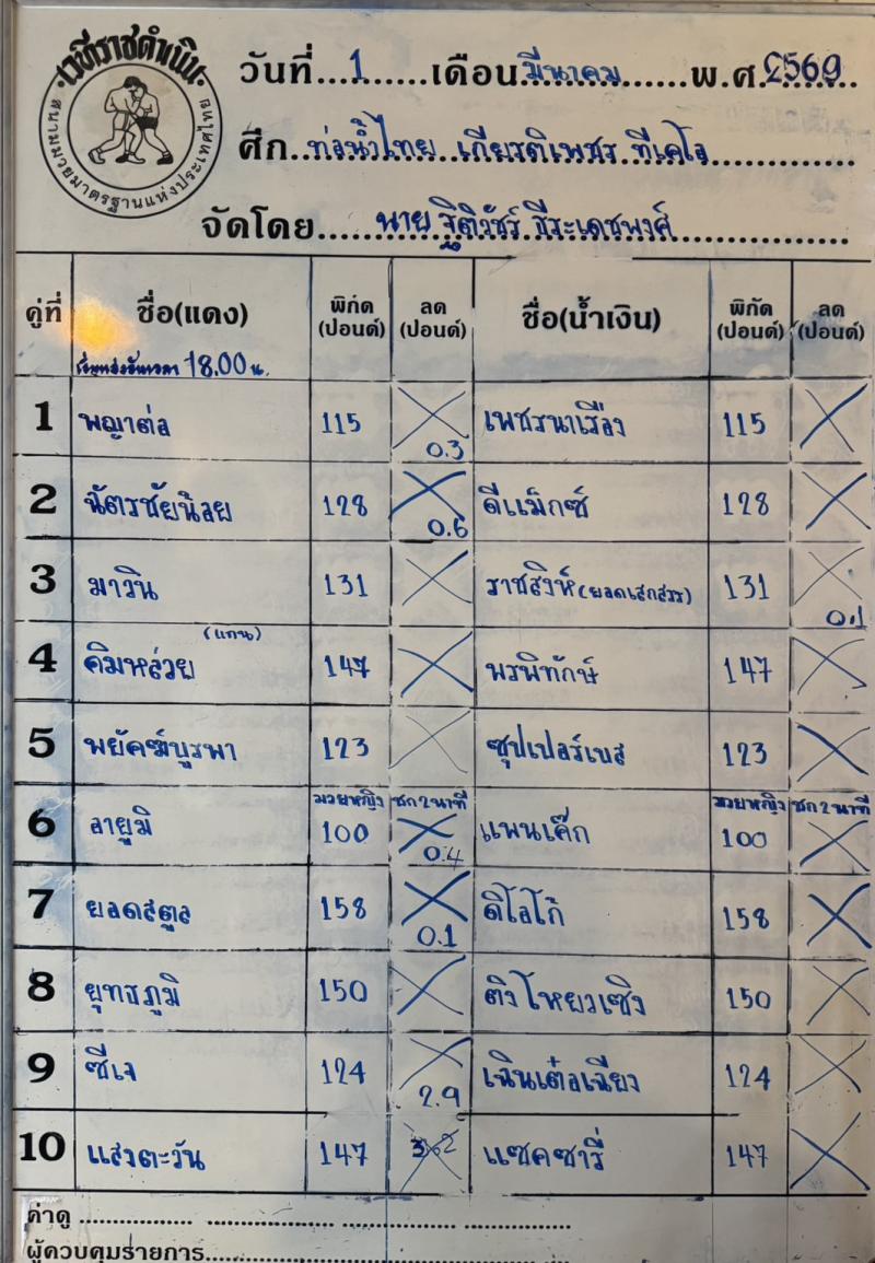 | ยอดสตูล ส.โชคมีชัย | ชนะน็อกยก 1 | ดิเอโก้ แสงมรกต |